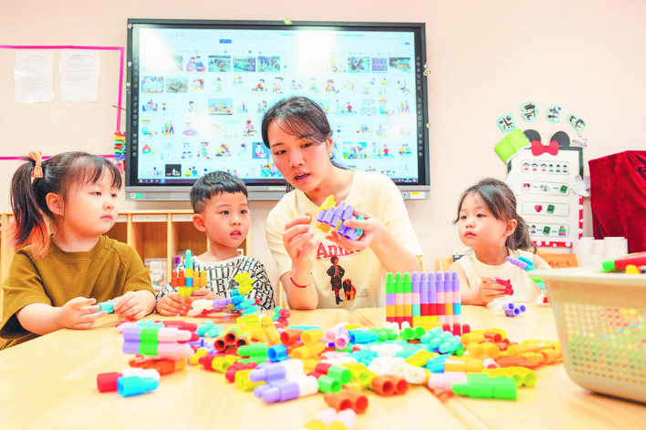 在庐阳区林店街道华美幼儿园,幼儿小朋友正在老师带领下玩游戏。记者 张正朋 通讯员 薛知强 摄