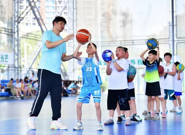 “汗动青春,营在江城”2023年“奔跑吧·少年”夏令营篮球第一课上,教练纠正学生动作。图片来源:长江日报