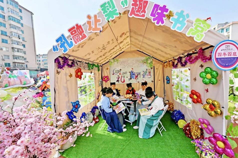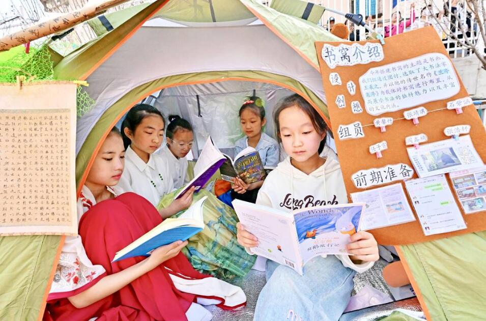 在明山区实验小学阅读综合实践活动现场,操场变成了大型读书露营地,同学们亲手设计搭建了“梦回兰亭”“科技‘童’行”“走进苏轼”等一个个创意十足的“书窝”。大家以“书”为介,穿梭其中,品书香之气,还进行了阅读分享、课本剧演绎、吟诗作对等多种形式的阅读活动。