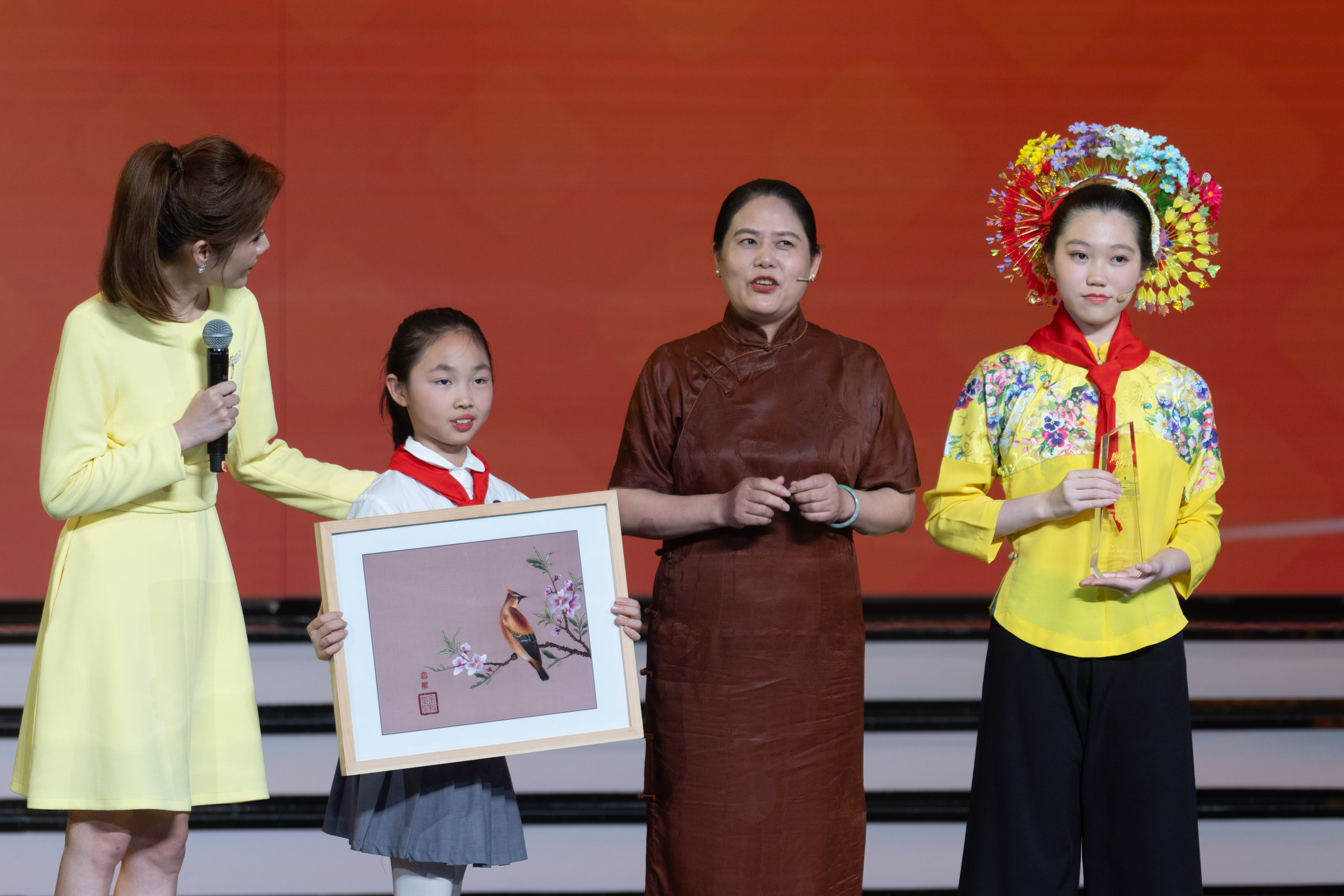 国家级非遗项目苏绣代表性传承人卢建英为黄馨怡颁奖。供图:江苏省文明办