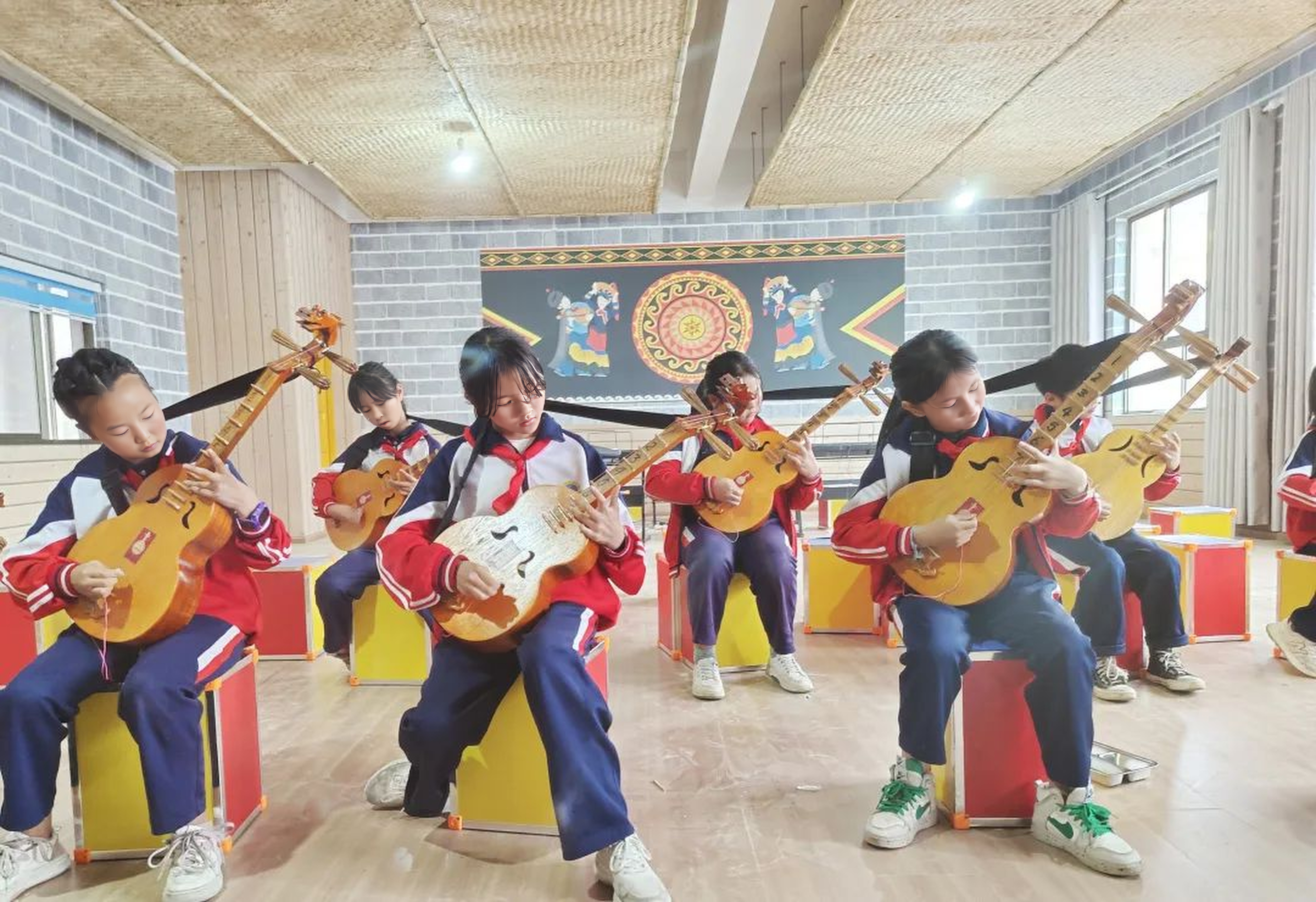 孩子们在兴仁市大山小学乡村学校少年宫学习彝族月琴。兴仁市文明网供图