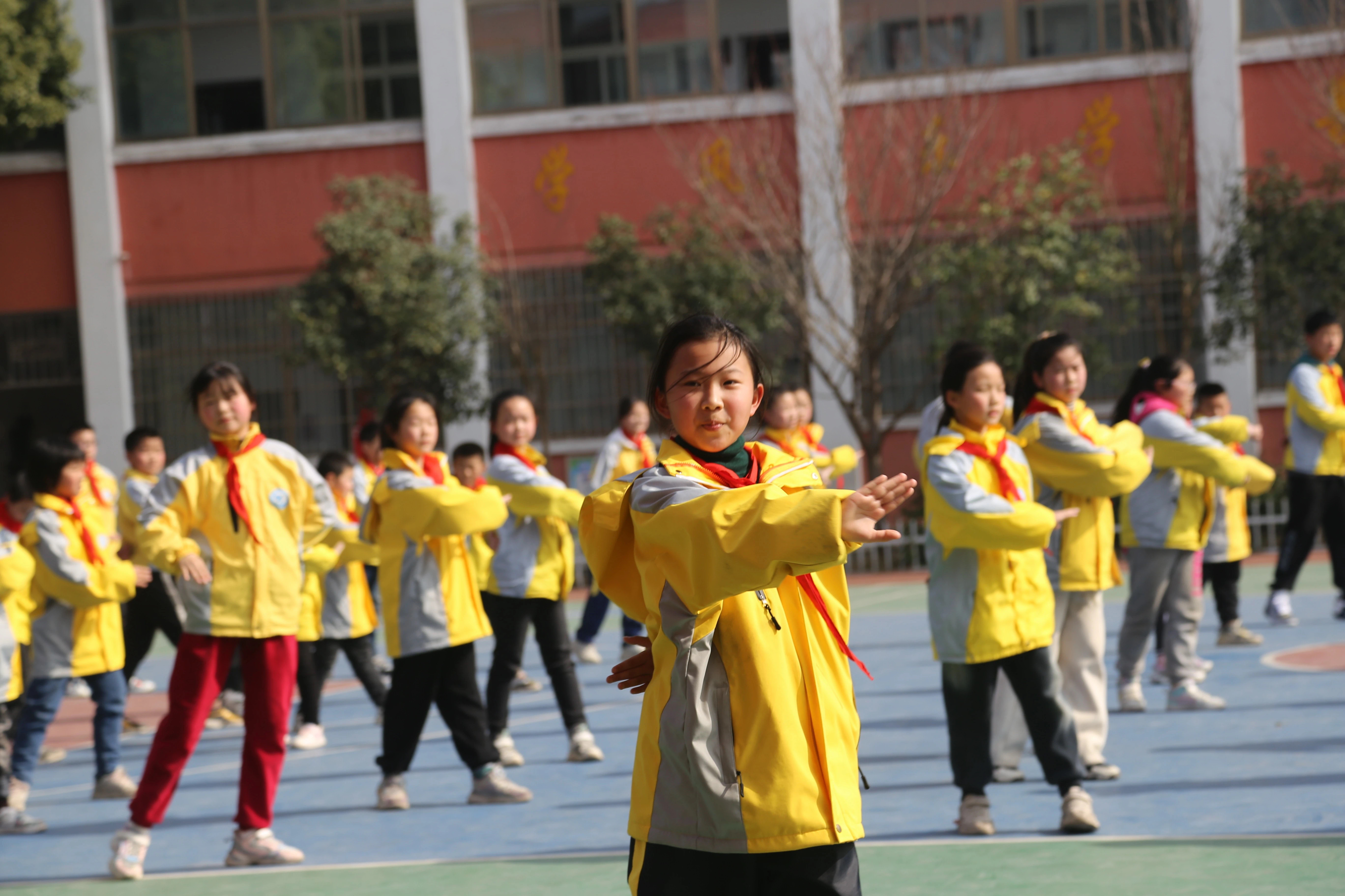 同学们在操场做起黄梅艺术操。
