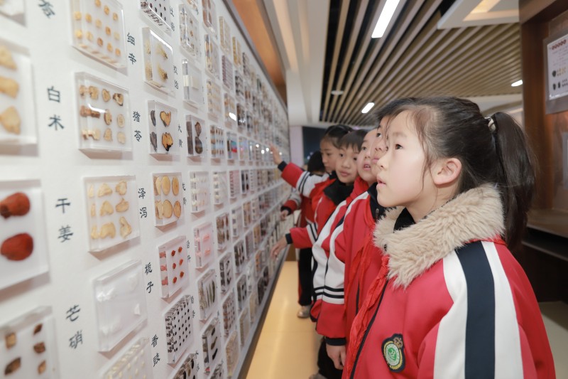 南阳市第二十三小学校学生走进南阳医学高等专科学校传统医药非物质文化遗产传承创新中心开展研学实践,辨识中药材。南阳市文明办供图 周梦 摄