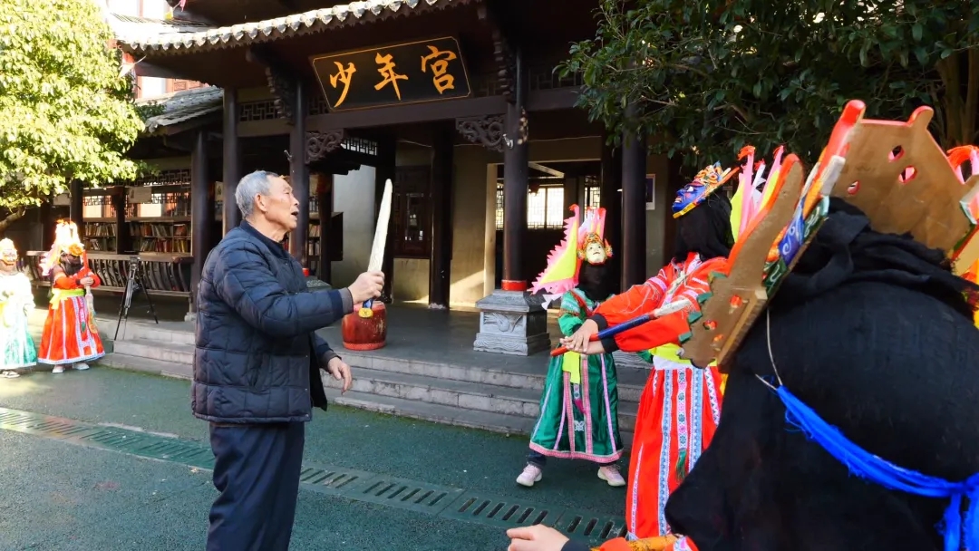 地戏国家级代表性传承人作为学校少年宫地戏课堂的老师,他们把自己的毕生所学带到学校,带给孩子们。从台步、唱功,再到身段等基本功的教学,老师们总是耐心地传教。同时,通过向小队员们讲解地戏的历史,让他们从内而外地运用不同表演手法,以此来表达人物的思想感情。在老师的精心教学下,少儿地戏队的小队员们代表学校参加了众多的大型活动表演。