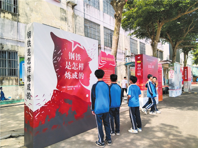 《青春之歌》《恰同学少年》《红岩》《可爱的中国》……在海口市遵谭中学操场上,由一本本巨型红色经典“图书”排列而成的“时光书廊”格外引人注意,学生老师们纷纷在“图书”下拍照打卡,一起讨论、分享书中的红色故事。