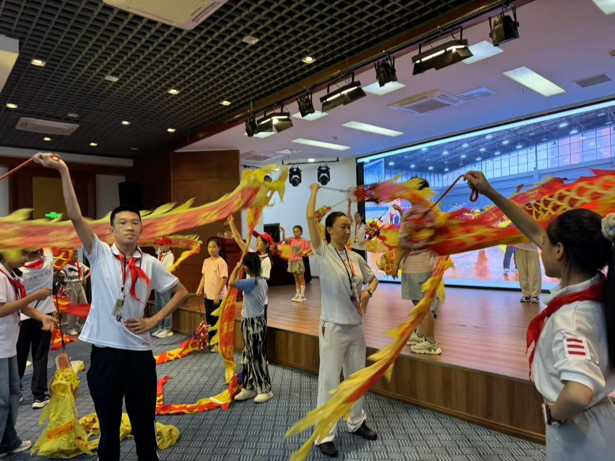 两地“新时代好少年”共同体验非遗项目“彩带龙”技艺。