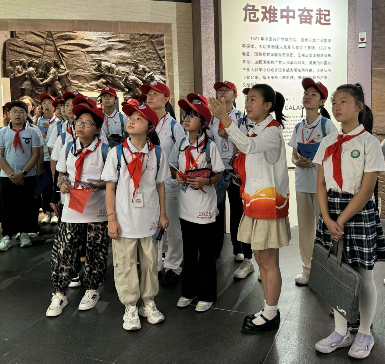 序厅“石破天惊”圆雕前,两地学子并肩而立。随着讲解员对1927年8月1日南昌起义历史的深情讲述,划破暗夜的枪响仿佛在展厅回响,历史的厚重感与先辈的理想信念深深触动着每位学子。时空对话中,先辈的理想信念正以“南北联动”的方式传承。