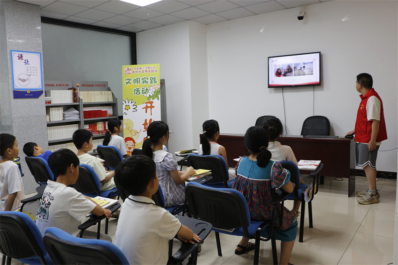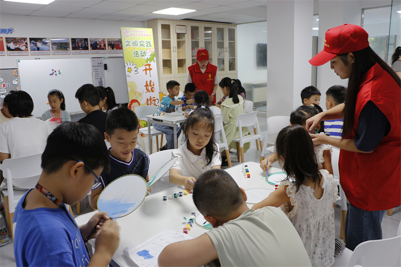 近日,四川省内江市威远县严陵镇悦城社区新时代文明实践站里墨香阵阵,20名孩子在文明实践志愿者指导下学习画团扇。孩子们手执彩笔将花朵、大海等元素勾勒于扇面,举着作品高兴地对记者说:“这里朋友多,每天能学新东西,我们特别开心!”