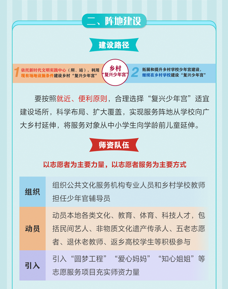 部署开展乡村“复兴少年宫”建设,进一步改进和创新农村未成年人思想道德建设,培养德智体美劳全面发展的社会主义建设者和接班人