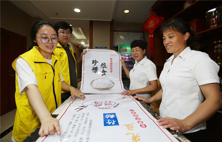 西湖镇经圩村成立“制止餐饮浪费 宣传节约粮食”志愿服务队,进饭店向服务人员进行宣讲。