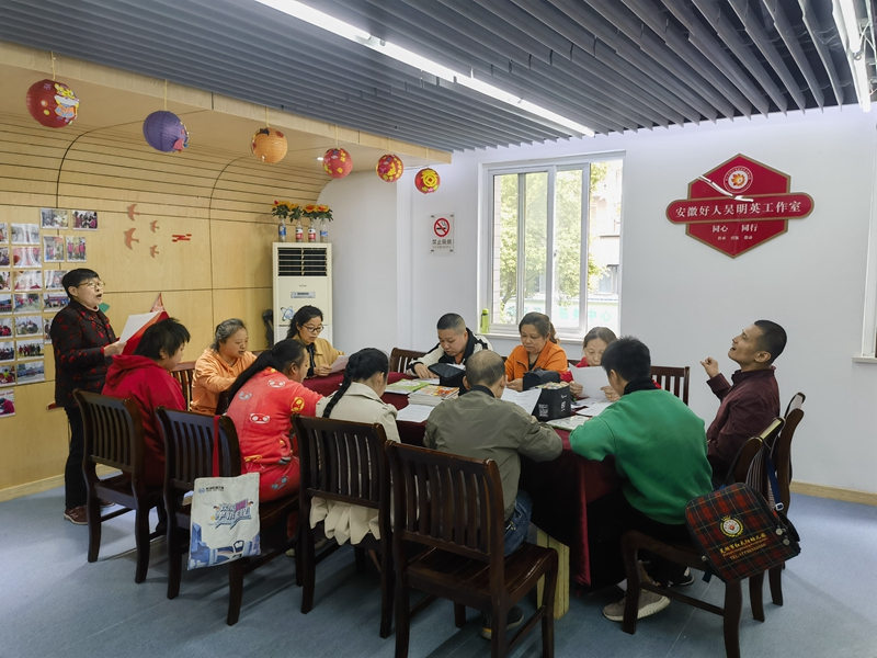 日前,在芜湖市鸠江区四褐山街道管山社区,“中国好人”吴明英正领着孩子们一起唱歌。2007年,管山社区建立工疗站,吴明英主动请缨担任辅导老师,16年来,她义务负责智力障碍学员的康复训练和教育托养工作。为了发挥榜样引领作用,管山社区成立吴明英好人工作室,组建了金色阳光志愿服务队,致力于扶残助残、扶老助困、好人巡讲及“干净路段”认领等多项惠民志愿服务活动。在吴明英的影响带动下,金色阳光志愿服务队吸引了“芜湖好人”魏秀霞、“鸠江好人”周令印等众多志愿者加入。截至目前,服务队已经参与扶残助残、扶老助困等多项惠民暖心志愿服务活动100余次,受益人数800余人。