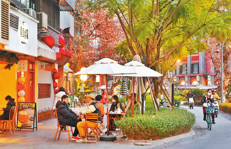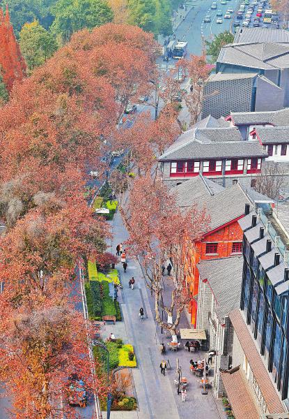 四川省成都市武侯区大学路两侧的法国梧桐树,在冬日暖阳的斜照下,光影斑驳,让人陶醉。趁着阳光正好,年轻人在树下喝茶、喝咖啡,在精致的小店门前拍照、聊天,展示着“成都式”的安适和日常。如今,这条历史悠久的华西坝大学路在城市更新中摇身一变,晋升成了一条成都市的宝藏小街道。
