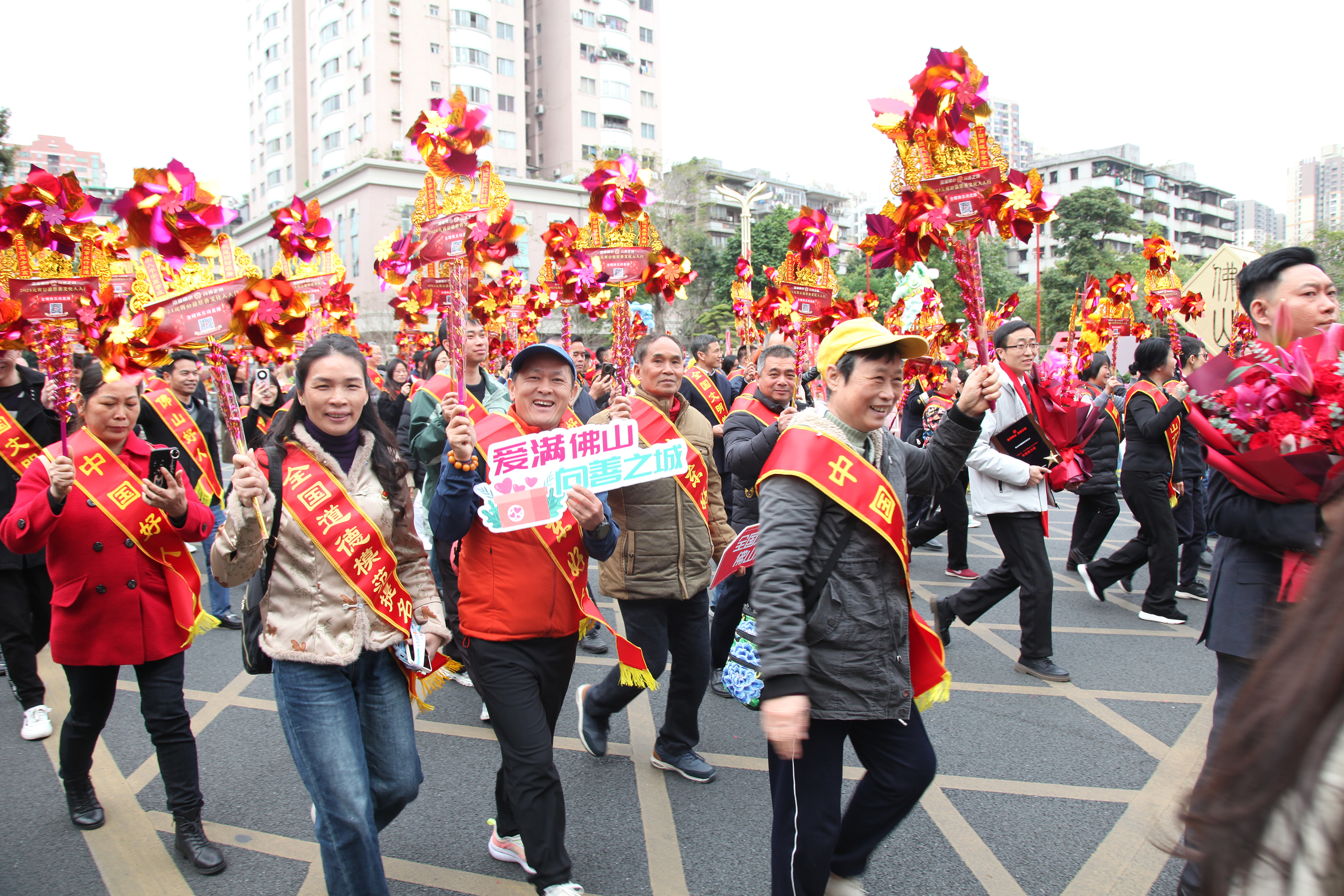 “爱满佛山,向善之城!”“环保节约、引‘菜’归家”“共创文明佛山,共享美好家园!”伴随着一声声鼓舞人心的口号,由道德模范和身边好人等各级各类先进组成的第一方阵带头走过通济桥,向市民发出共建共享文明城市、文明礼让参加活动、友爱互助热心公益等文明倡议。
