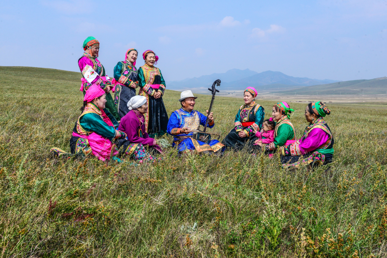 来自扎鲁特旗“乌力格尔之乡”的艺术家在草原上表演传统的蒙古族说唱艺术。