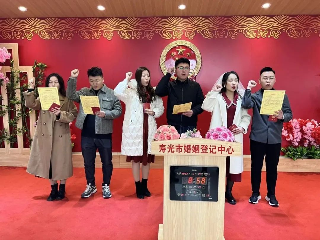 “我们自愿结为夫妻,从今天开始,我们将共同肩负起婚姻赋予我们的责任和义务,上孝父母,下教子女,互敬互爱……”在民政局婚姻登记中心,新人手拿结婚证,在庄严的国徽下宣读结婚誓词。该仪式是寿光市婚姻登记中心为促进家庭和谐稳定,结合婚俗改革采取的创新举措。