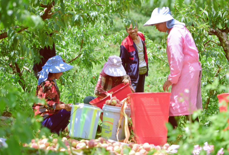 绿化村桃花谷艳红桃丰收。
