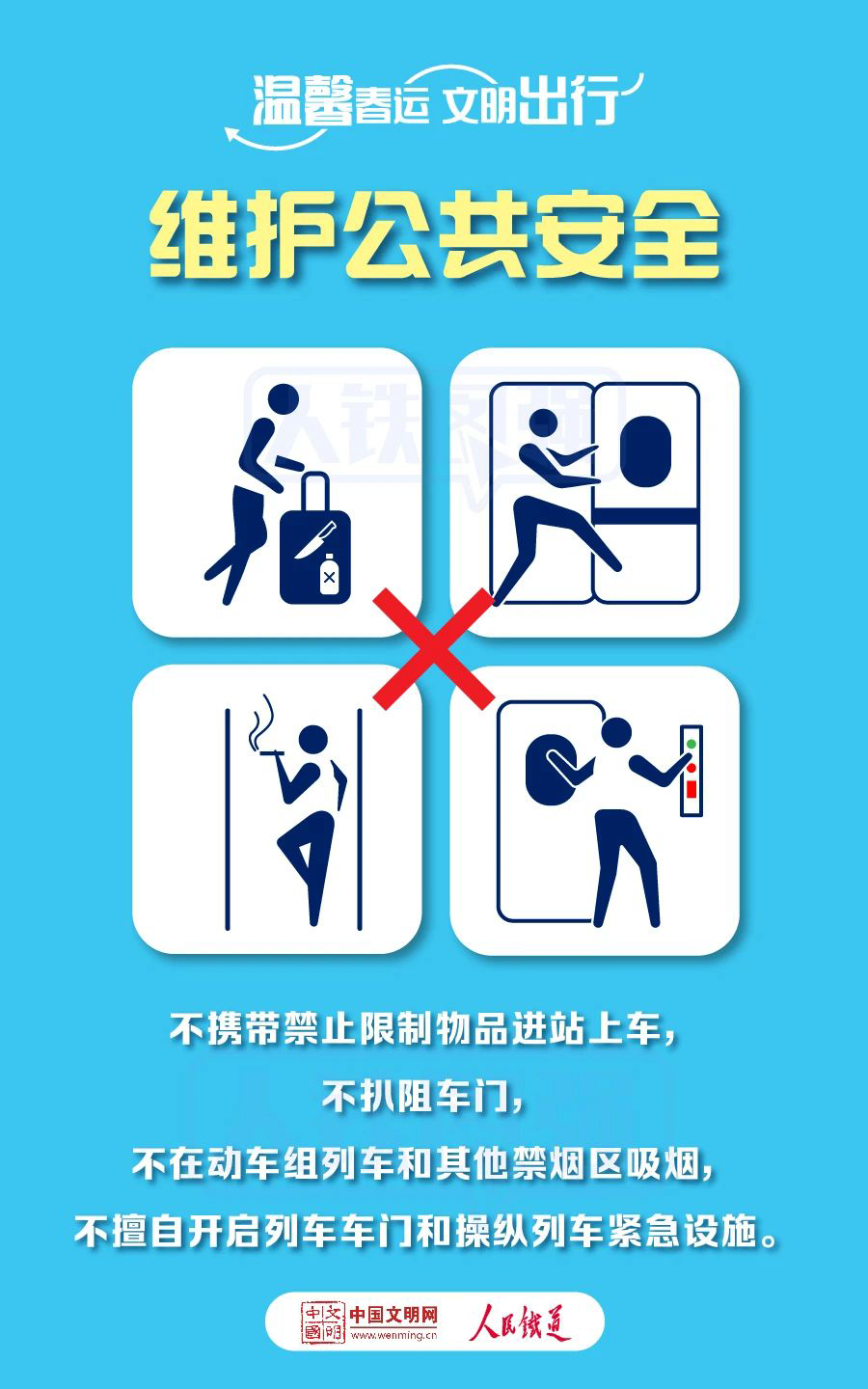 2. 维护公共安全。不携带禁止限制物品进站上车,不扒阻车门,不在动车组列车和其他禁烟区吸烟,不擅自开启列车车门和操纵列车紧急设施。