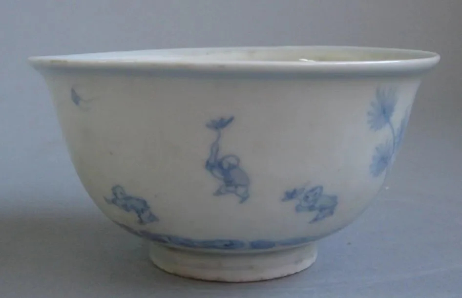 北京艺术博物馆馆藏的一个明万历淡描青花婴戏图碗,碗为鼓腹、撇口、圈足,整体以淡描青花绘制纹饰图案。外壁一周绘婴戏图,其中一个小童手持风筝,快乐地奔跑,一旁其余孩童有的斗草、捕蝶玩得不亦乐乎,生动描绘了儿童活泼、快乐与顽皮的天性;近底部绘卷草纹一周以作装饰。