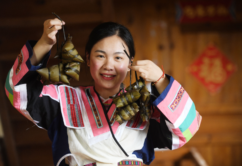 6月5日,广西桂林市龙胜各族自治县三门镇安康村的村民展示刚包好的粽子。端午临近,各地举行赛龙舟、包粽子、摘艾叶、做香囊等丰富多彩的活动,迎接传统佳节。新华社发 潘志祥 摄
