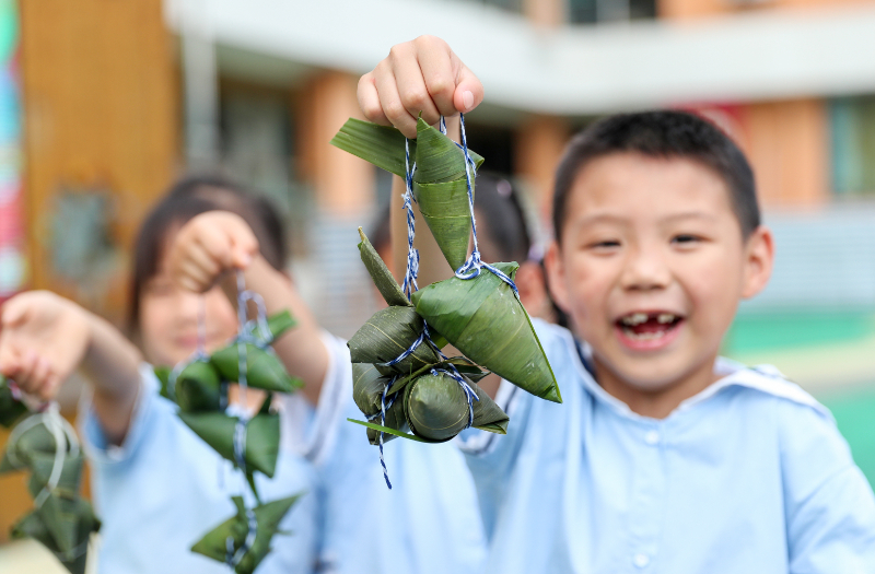 6月5日,四川省华蓥市杜家坪幼儿园的小朋友展示自己包的粽子。端午临近,各地举行赛龙舟、包粽子、摘艾叶、做香囊等丰富多彩的活动,迎接传统佳节。新华社发 邱海鹰 摄