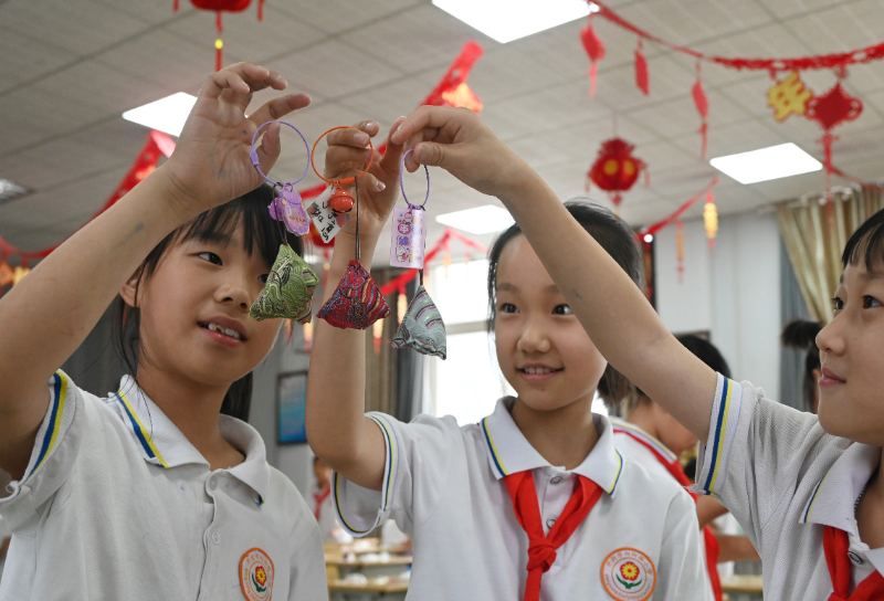 6月5日,河南省开封市向阳路小学的学生展示自己制作的香囊。端午临近,各地举行赛龙舟、包粽子、摘艾叶、做香囊等丰富多彩的活动,迎接传统佳节。新华社发 李俊生 摄