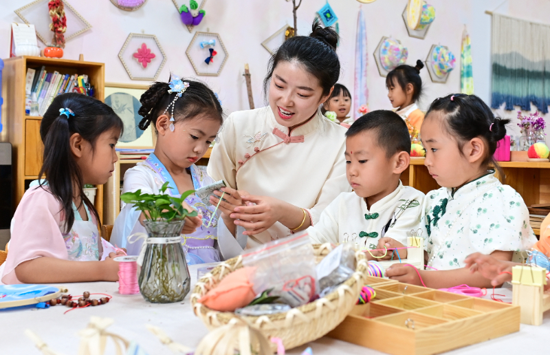 6月5日,内蒙古鄂尔多斯市康巴什区第十二幼儿园的老师指导孩子们做香囊、编织五彩绳。端午临近,各地举行赛龙舟、包粽子、摘艾叶、做香囊等丰富多彩的活动,迎接传统佳节。新华社发 王正 摄
