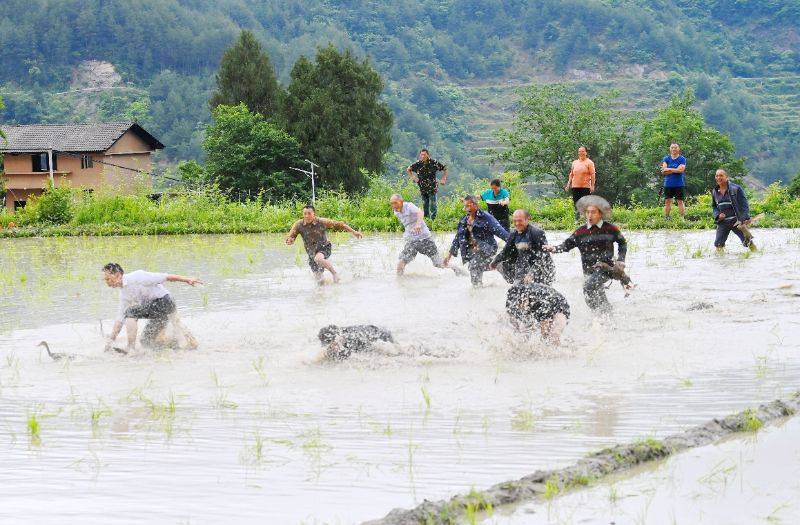 6月5日,重庆市酉阳土家族苗族自治县花田乡何家岩村的村民参加庆端午民俗活动。端午临近,各地举行赛龙舟、包粽子、摘艾叶、做香囊等丰富多彩的活动,迎接传统佳节。新华社发 陈碧生 摄