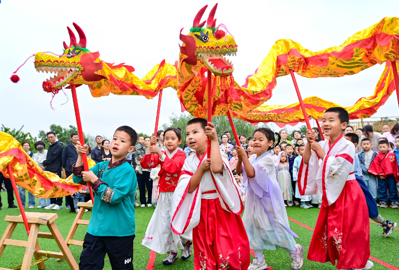 6月5日,河南省济源市第一幼儿园的小朋友在体验舞龙。端午临近,各地举行赛龙舟、包粽子、摘艾叶、做香囊等丰富多彩的活动,迎接传统佳节。新华社发 段二平 摄