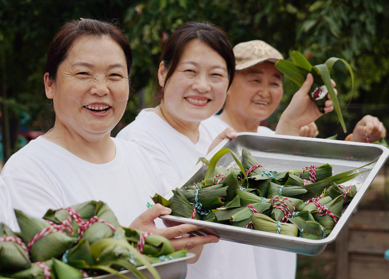 6月5日,河北省固安县马庄镇林子里村的村民展示包好的粽子。端午临近,各地举行赛龙舟、包粽子、摘艾叶、做香囊等丰富多彩的活动,迎接传统佳节。新华社发 门丛硕 摄