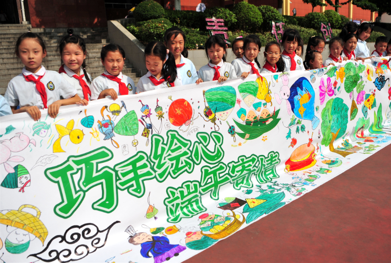 6月5日,湖北省宜昌市夷陵区实验小学的学生展示迎端午绘画作品。端午临近,各地举行赛龙舟、包粽子、摘艾叶、做香囊等丰富多彩的活动,迎接传统佳节。新华社发 张国荣 摄
