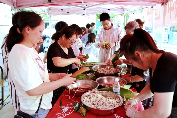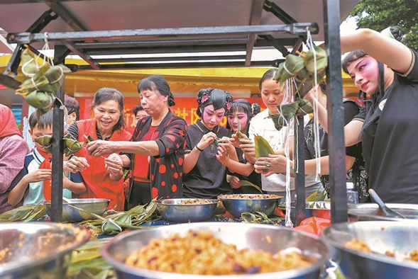 在泉州首个新时代文明实践一条街——东湖街,多单位联合举办“我们的节日·端午”主题活动,图为高甲戏演员和社区居民一同包粽子。