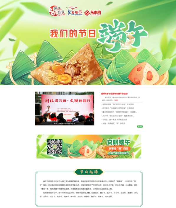与此同时,福建文明风网推出“我们的节日·端午”专题页,通过节日起源、节日民俗、节日新风等多栏目展现福建各地精彩纷呈端午节文明实践活动,在弘扬中华优秀传统文化中丰富群众精神文化生活。