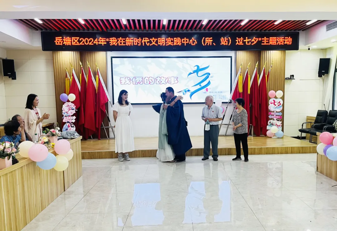 湖南省湘潭市岳塘区开展了“我在新时代文明实践中心(所、站)过七夕”主题活动。现场邀请20对金婚、银婚和新婚夫妇家庭,通过古风表演、爱的告白、家风传承等环节,让居民朋友们尽情体验传统古典浪漫的节日氛围,在爱的告白与互动交流中共颂传承“家·爱”好家风。