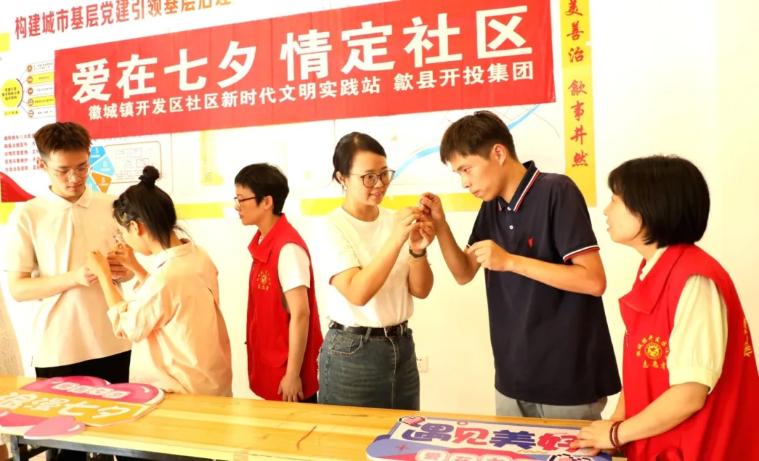 安徽省黄山市歙县徽城镇开发区社区新时代文明实践站举办“爱在七夕 情定社区”联谊活动,青年男女通过 “穿针引线”“三足齐心”“爱情套圈”等互动游戏,增加交流机会和相互了解,促成年轻职工在繁忙工作中找到爱的归属。