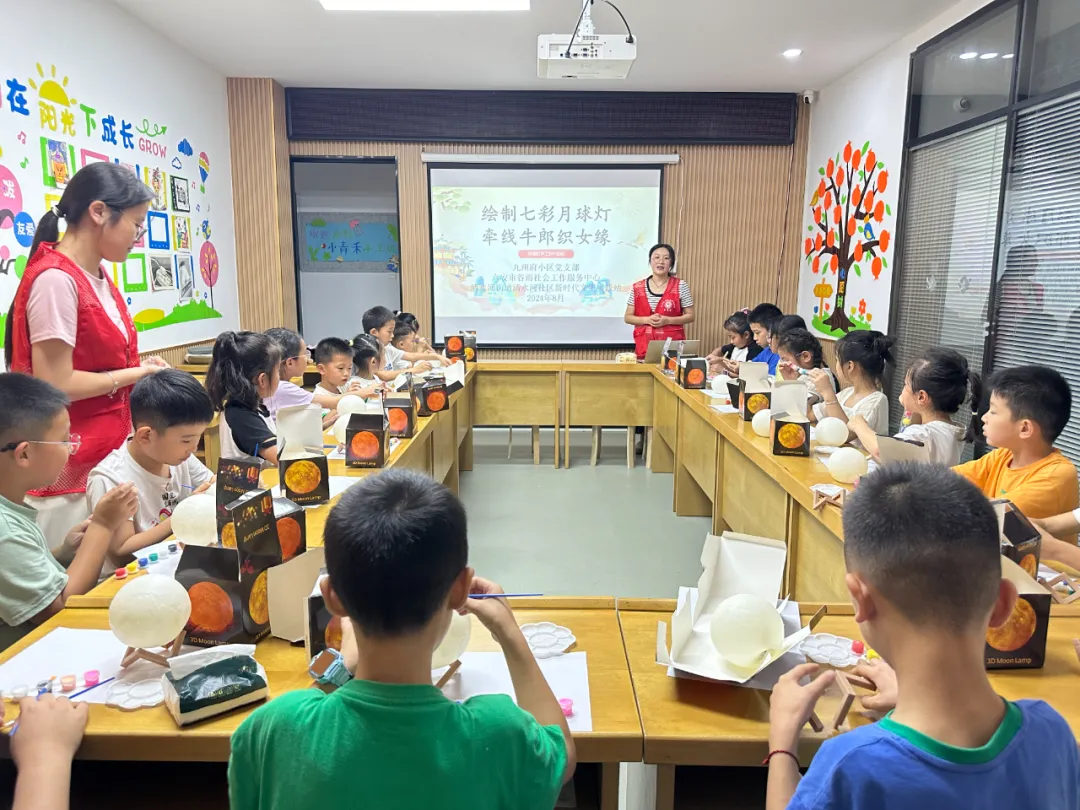 安徽省六安市金安区清水河街道清水河社区新时代文明实践站开展了“绘制七彩月球灯 牵线牛郎织女缘”手工DIY活动,让孩子们在动手实践中感受传统文化的魅力,表达对“七夕节”的美好祝福,同时激发他们对宇宙探索的热情。