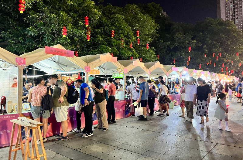演出结束后,“七夕·乞巧”沉浸式园游会随即开始。园游会上,创新融合的活动让观众耳目一新。观众不仅可以驻足聆听广东音乐五架头传统演奏《彩云追月》等经典曲目,还可以逛非遗市集探寻好物,亦或是参与体验电影《落凡尘》创意打卡及角色扮演互动等,丰富多彩的园游会以多种艺术形式呈现,从视觉、听觉到互动体验,为观众提供多层次的文化享受。