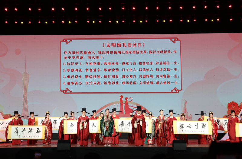 为推进移风易俗,弘扬文明新风,活动现场还举行了文明婚礼倡议仪式,文明家庭、金婚家庭代表带领新人共同诵读《文明婚礼倡议书》,发出婚礼简办倡议,倡导健康婚恋,颂扬家庭和睦,发扬中华民族传统家庭美德,建设新时代家风文化。