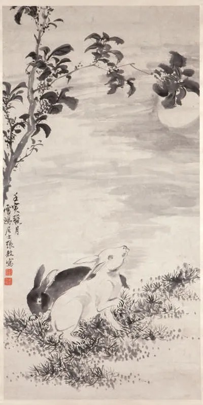 魏晋以后,嫦娥身边玉兔捣药的说法日益盛行。到了明清,玉兔因为其捣药职能甚至作为月神被单独敬奉,也成为艺术家中秋主题创作的重要对象。图为清代张敔《月下桂兔图》。