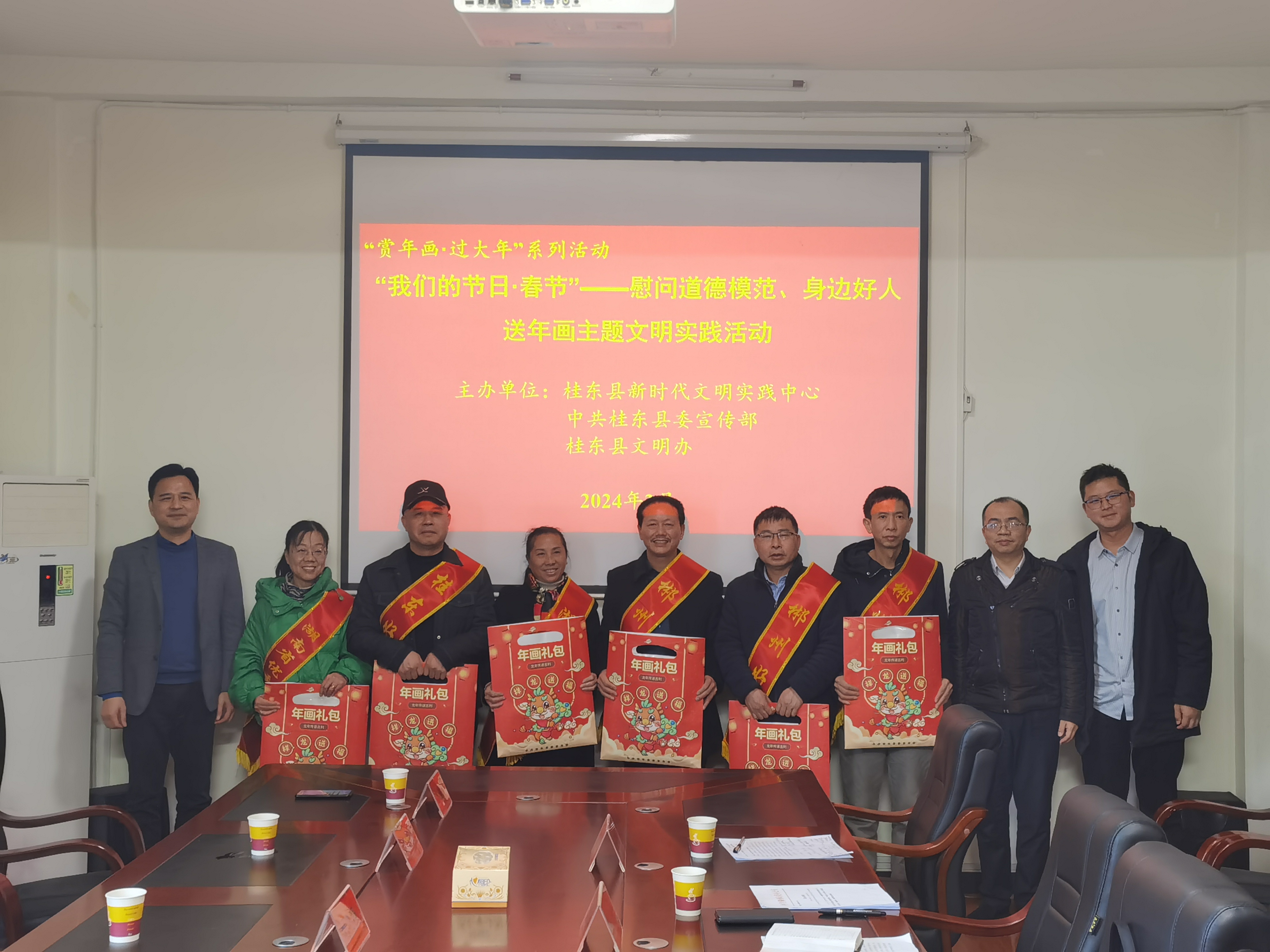 湖南省郴州市桂东县新时代文明实践中心开展“我们的节日·春节”——慰问道德模范、身边好人送年画主题文明实践活动。活动中,好人典型齐聚一堂,就身边的好人事迹和平时所遇所想进行了交流分享,并收到了年画礼包和新春祝福。桂东县还依托新时代文明实践中心举办了“新生活·新风尚·新年画”——赏年画·过大年美术作品展示活动,作品以年俗、丰收等喜庆祥和的题材为主,为广大市民献上一场文化盛宴。