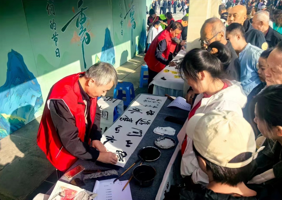 参加全国2024“我们的节日·重阳”主题主场活动的志愿者书写毛笔书法。(陕西省委宣传部文明实践处供图)