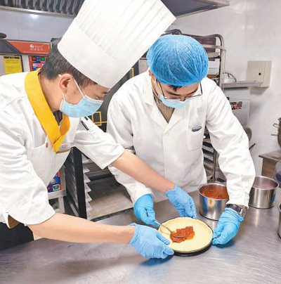 上午8点20分,记者提前来到烘焙店,赶在送餐前先“练练手”。32平方米的烘焙间里,设备摆放有序。“比萨怎么做?”“先擀皮,再把各种馅料撒在表面,烤箱一热就能出炉。”后厨师傅席爱国答道,“面饼边缘要多铺点配料,保证旅客一口咬下去,什么配料都能吃到。”