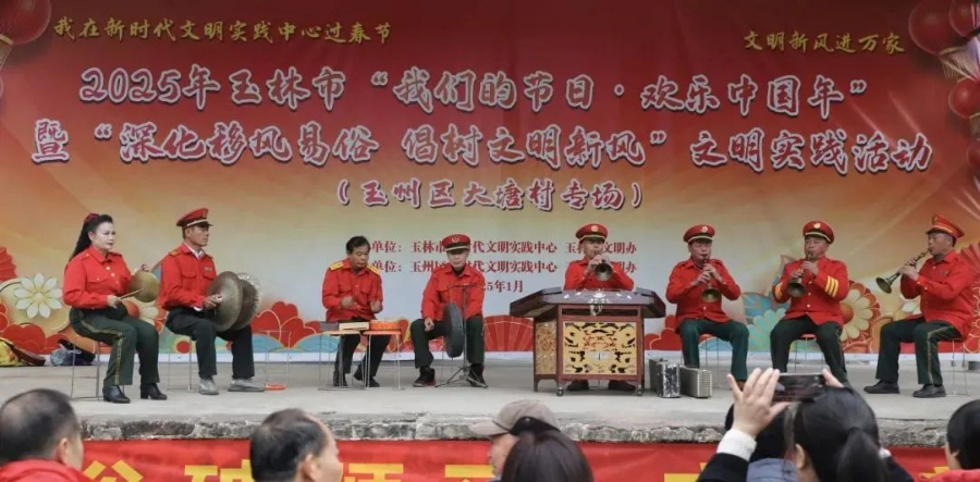 由玉林市新时代文明实践中心、玉林市文明办联合有关县(市、区)组织的玉林市“我们的节日·欢乐中国年”暨“深化移风易俗 倡树文明新风”新时代文明实践主题系列活动在玉林市玉州区大塘镇大塘村举行。现场开展了非遗展演、移风易俗有奖问答、义诊、写春联等活动,现场气氛热烈。