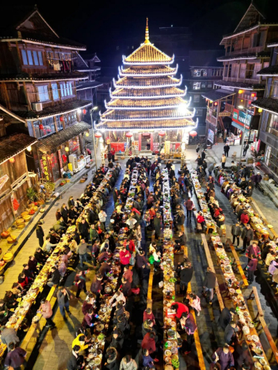 柳州三江侗族自治县林溪镇茶溪村到程阳八寨景区马安屯开展“月也”活动,两地群众以芦笙踩堂、赛芦笙、百家宴、文艺表演等丰富节目,倾情展示侗乡多彩风情,进一步丰富侗寨夜间文化生活,喜迎新春到来,吸引众多游客前往观赏体验。