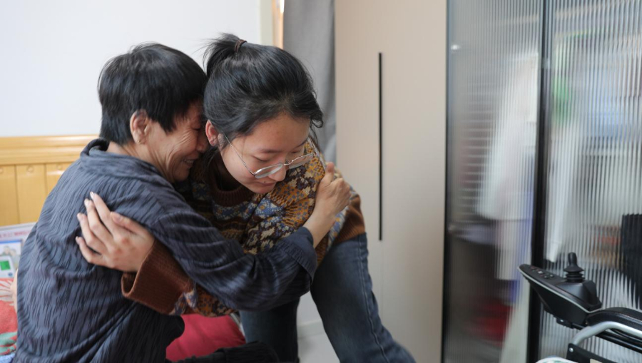 刘羲檬把母亲抱上轮椅。王钰 摄