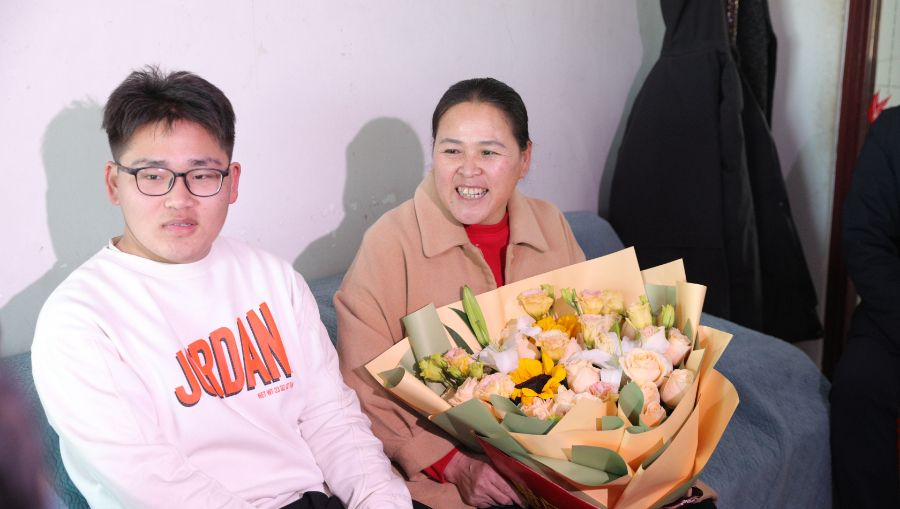全国道德模范王峥嵘(右)收到新春慰问和鲜花。王钰 摄