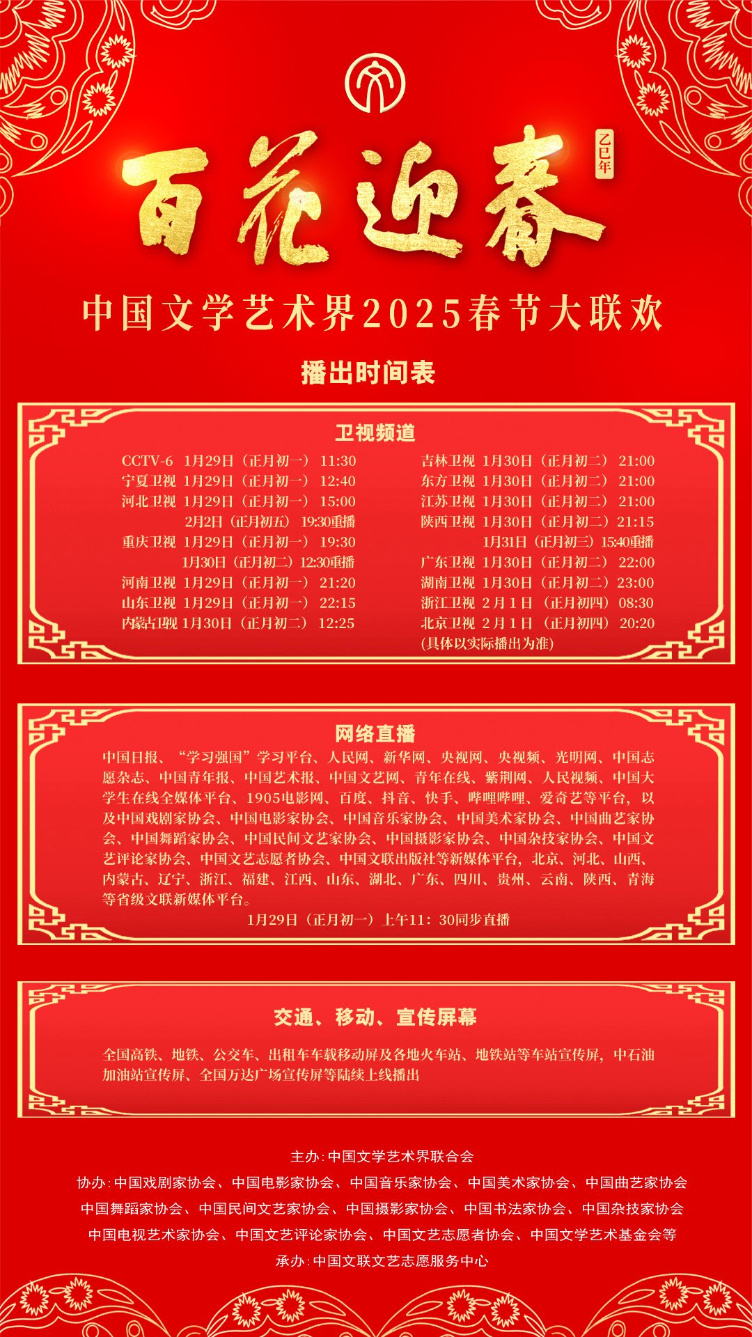 “百花迎春——中国文学艺术界春节大联欢”是中国文联重要品牌活动,是文艺界规模最大的联欢盛会。2025年“百花迎春”以习近平文化思想为指引,深入学习贯彻党的二十届三中全会精神,在新春团圆之际,汇集老中青三代各艺术门类的优秀艺术家,以回“家”欢聚的形式,回到文联——文艺工作者的“大家庭”团聚,展现了新时代文艺工作者有信仰、有情怀、有担当的精神风貌。本次大联欢将传统文化与现代科技相融合,重点体现人民性、思想性、精品性、联欢性,内容多元时尚,汇聚各艺术门类的优秀成果,展现新时代中国文学艺术界的艺术成就。整台晚会围绕“小家、大家、国家”,在温暖清新的团圆氛围中展现文艺工作者的“家国情怀”。