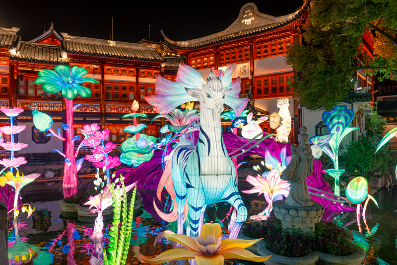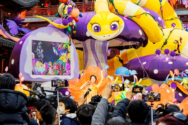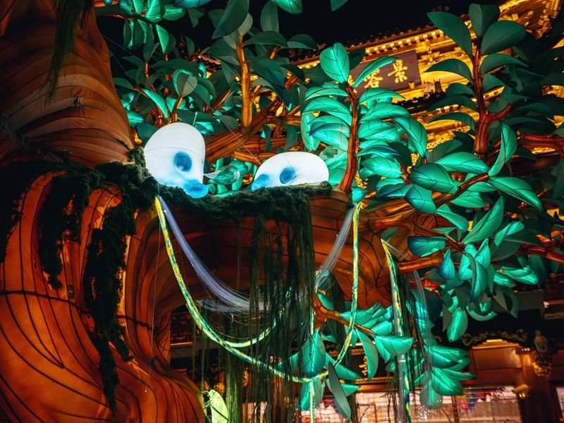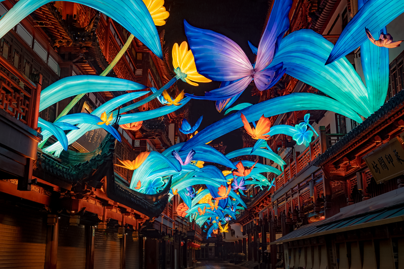 上海豫园灯会现场,游客仿佛进入了"庄周梦蝶"意境,尽显中式浪漫。