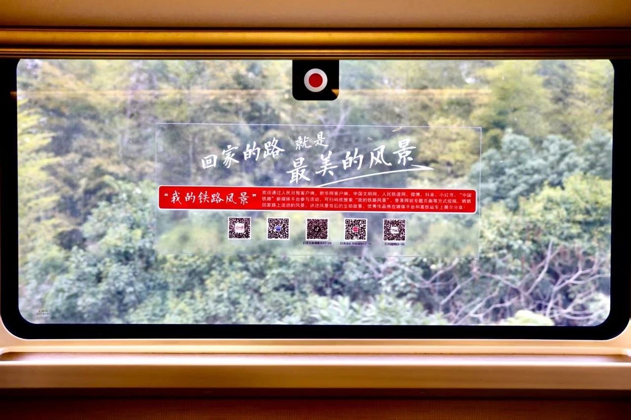 “回家的路就是最美风景”,由南昌开往厦门的G5314次列车上“我的铁路风景”主题窗花格外显眼。