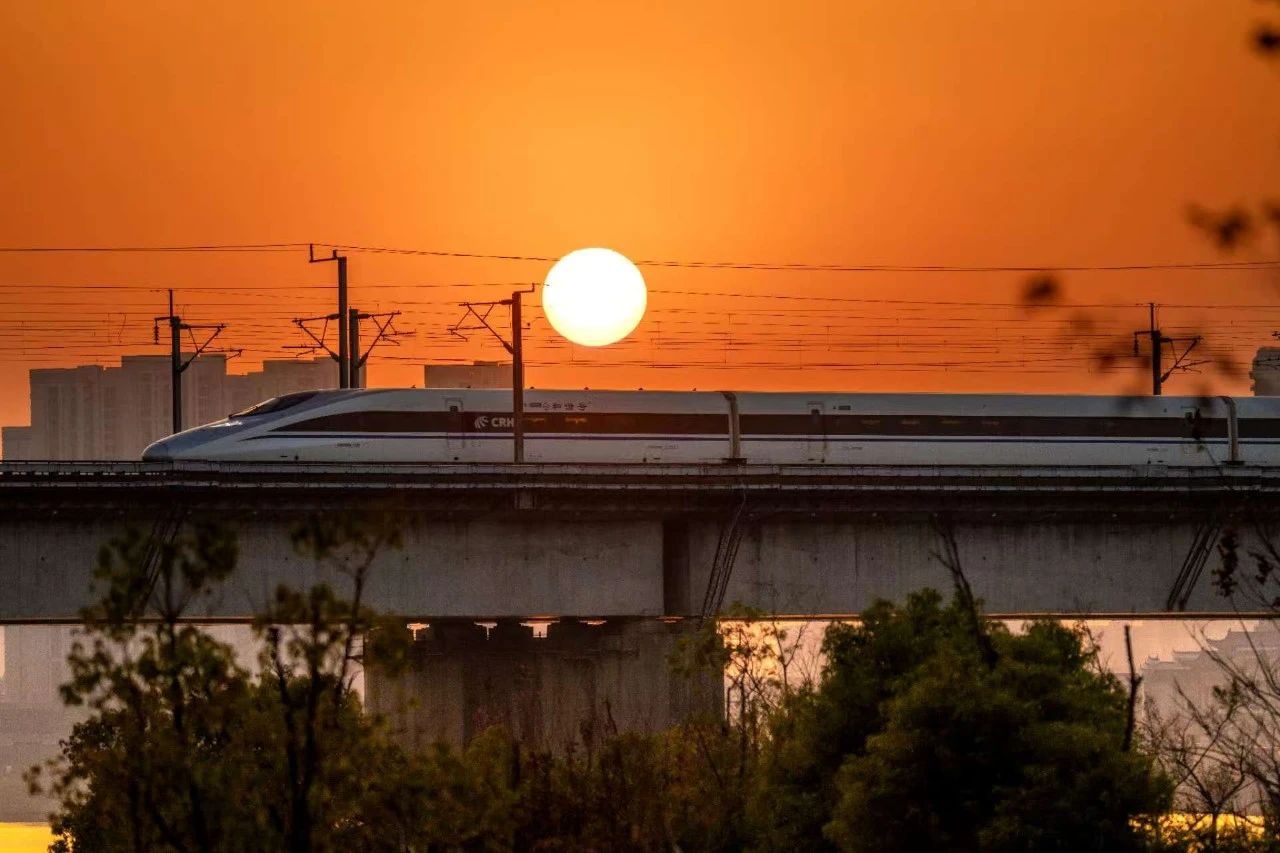 G5067次和谐号动车组在夕阳下通过铁路桥驶入南昌西站。