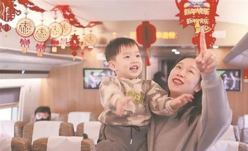 G3752次列车上,年轻母亲与孩子温馨互动。